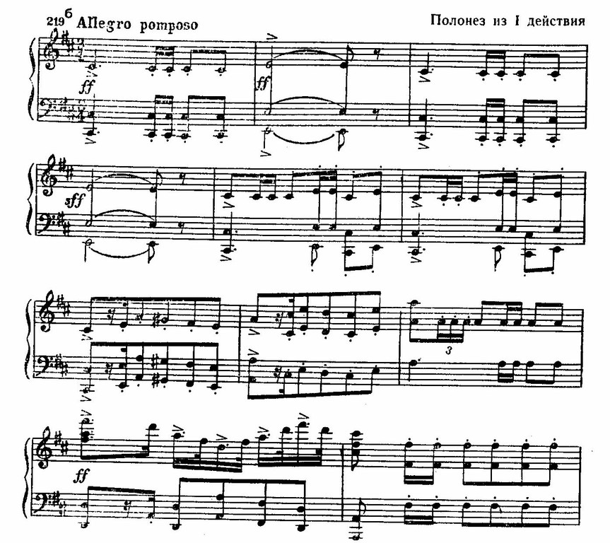 Большая часть музыки первого действия, происходящего в барской усадьбе, выдержана в ритме полонеза и бальной мазурки.