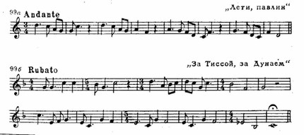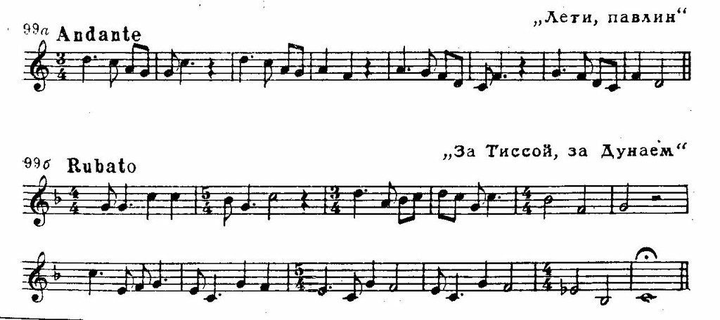 Удивительной красотой отличаются лирические крестьянские песни, разнообразные по характеру и настроению. Среди них встречаются: а) несложные песни, сохранившие древний пентатонический звукоряд; б) протяжные песни в свободном движении (tempo rubato), без определенной метрической сетки; в) подвижные песни с четким ритмом, танцевального склада (tempo giusto):