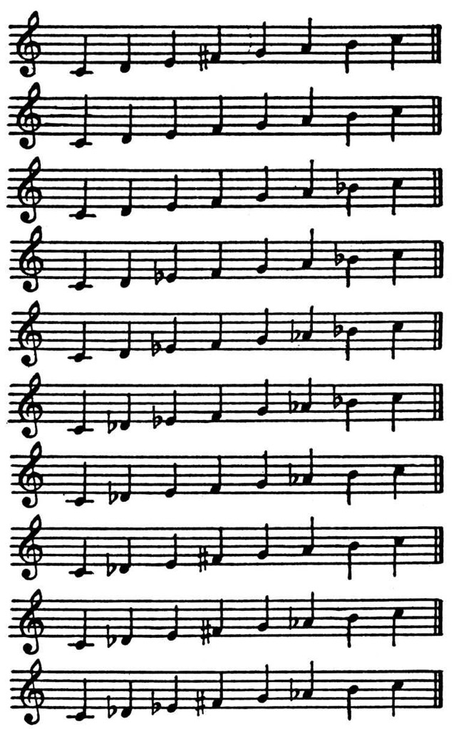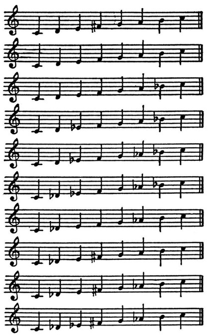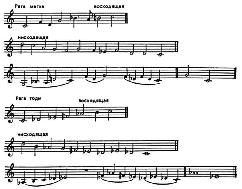 В Индии различают 6 основных и большое количество побочных гамм, построенных по принципу сочетания нижнего и верхнего тетрахордов.