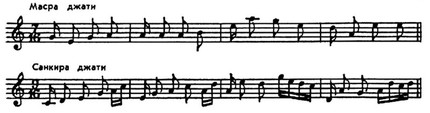 Трактат по театру, музыке и танцу «Натьяшастра» (1 в. н. э.) даёт основание считать, что ещё задолго до его создания индийцы располагали высокоразвитой, глубоко своеобразной и оригинальной муз. системой. В «Натьяшастре» подробно описываются разнообразные формы вок. и инстр. музыки, особые типы священных кантилен джати (см. пример ниже), муз. инструменты и состав театр. оркестра.