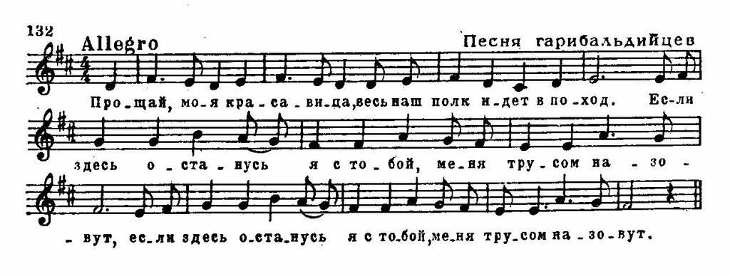 Гражданскими мотивами проникнута также поэзия Рисорджименто, усвоившая то лучшее, что было создано У. Фосколо, Г. Россетти, Дж. Леопарди в предшествующий, карбонарский период. Особой силой выражения отмечены произведения поэтов — участников революции 1848—1849 годов. Созданные ими революционные песни получили широчайшее распространение. Таковы, например, «Гимн Гарибальди» (музыка А. Оливьери, текст Л. Меркантини) или популярная народная песня гарибальдийцев: