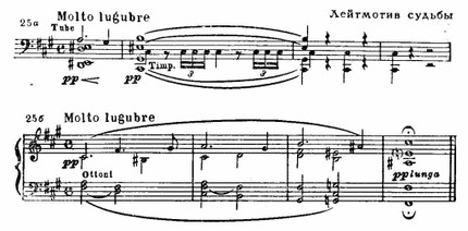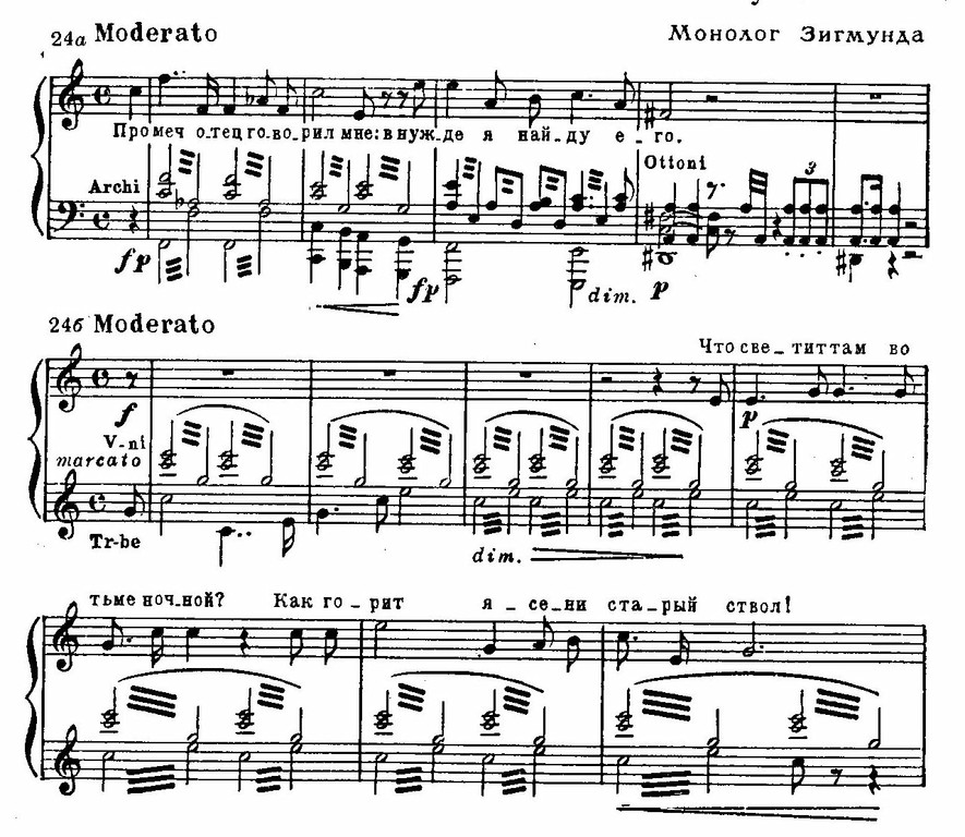 К тому же эти мотивы нередко развиваются, трансформируются. Например, мотив бури в начале «Валькирии» преображается в восторженную песнь, воспевающую поэзию летней ночи, и развивается в любовной сцене Зигмунда и Зиглинды. Преображается в той же опере и вариант лейтмотива судьбы (см. пример 25б), приобретая торжественно-победное звучание в заключении диалога Брунгильды и Зигмунда, и т. д.