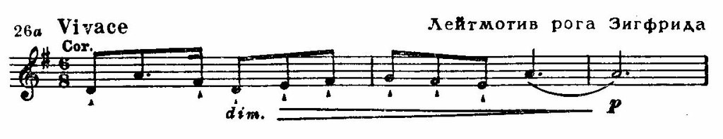 Квартовый затакт и «трезвучная» основа этого лейтмотива характерна для другого тематического комплекса, служащего выражению не лирического, а героического начала. Связанные с данной сферой темы отличаются внутренней подвижностью ритмических элементов при сохранении монолитного единства образа. Этому способствуют устойчивые аккордовые последования, движение мелодии по тонам разложенного или диатонически заполненного трезвучия. Для сравнения приводятся развернутые лейтмотивы Зигмунда и Зигфрида (последний родился из звучания призывного рога, см. пример 26а):