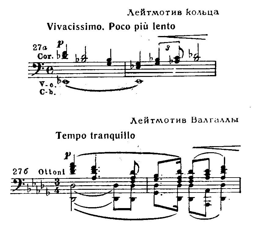 Так, при переходе от 1-й ко 2-й картине «Золота Рейна» подчеркнута образно-смысловая общность лейтмотивов кольца и Валгаллы как символа власти и могущества. Различие в гармонизации (в одном случае нонаккорд, в другом — простейшие гармонические последовательности) затушевывают эту общность. Она отчетливо обнаружится, если выписать начальные звуки мелодий, где совпадают и соотношения интервалов, и ритм:
