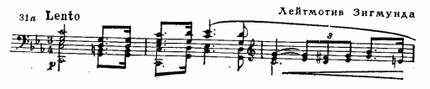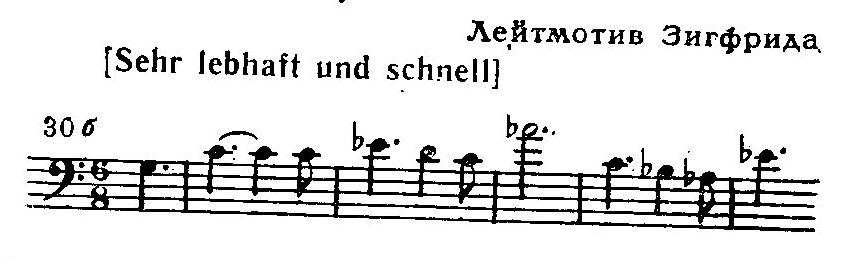 Второй мотив одновременно связан с лейтмотивом «жалобы Вель- зунгов», секстовый оборот которого рождает представление о широком скорбном вздохе. Этот «вздох», в свою очередь, содержится в лейтмотиве любви Брунгильды и Зигфрида: