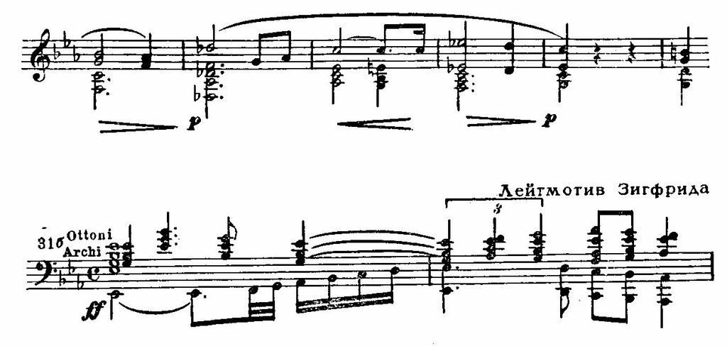 Разберем другой характерный пример — соло виолончели, обрисовывающее вспыхнувшую с первого взгляда страсть Зигмунда и Зиглинды («Валькирия»). В этой чудесной напевной мелодии заключены два мотива, которые (особенно второй) часто повторяются в опере. Нетрудно заметить, что эти два мотива возникают в развитии одной музыкальной мысли: