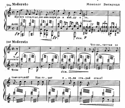 В «Валькирии» затронуты и другие средства выразительности. Стихийной мощью, неудержимой силой проникнута музыка полета валькирий (Этот фрагмент оперы широко известен как симфоническая пьеса.). Глубоким психологизмом отмечен ряд сцен, волнующих драматизмом чувств. К ним относятся, наряду со сценой встречи Зигмунда и Зиглинды, монолог Вотана во II акте и грустная, торжественная по тону беседа Брунгильды — вестницы смерти — с Зигмундом: диалог потрясает выразительностью декламации и красотой гармоний, звучащих pp у медных духовых инструментов (лейтмотив судьбы):