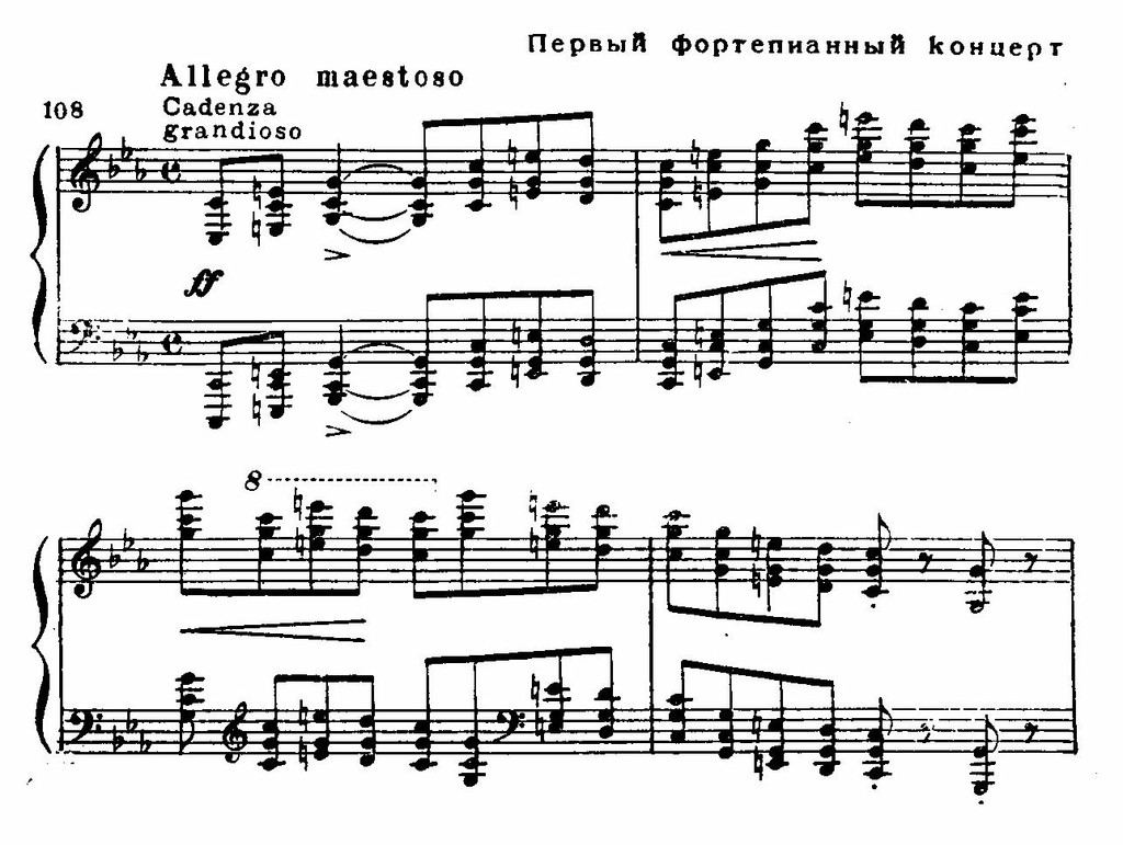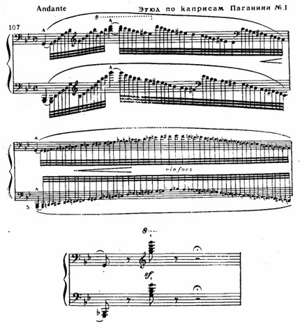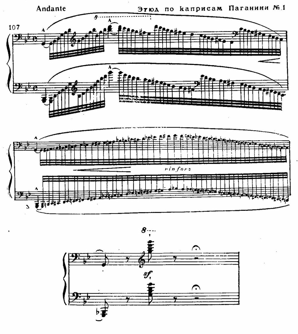Лист стремился использовать все регистры фортепиано: применял глубоко и сочно звучащие басы, мелодию переносил в средний, «виолончельный» регистр, а в «верхах» выявлял прозрачное, кристально-чистое звучание. Сопоставлению регистров в одновременности служили пассажи, словно одним броском охватывающие всю клавиатуру рояля (см. пример 107); он насыщал их аккордовыми комплексами, а сами аккорды давал в широком расположении (см. пример 108).