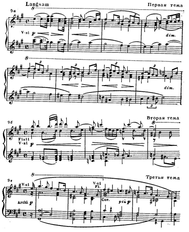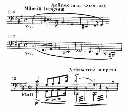 Темные силы зла, вероломства и коварства (они сконцентрированы в образе Ортруды) охарактеризованы группой тем — угловатых, колючих, использующих движение по тонам уменьшенного септаккорда (см. примеры 11а, б). Эти лейтмотивы пронизывают ткань оперы (на их развитии строится вся 1-я картина II акта); второй лейтмотив интонационно сродни грозному мотиву запрета (ср. начальные четыре звука в примерах 11б и 12):