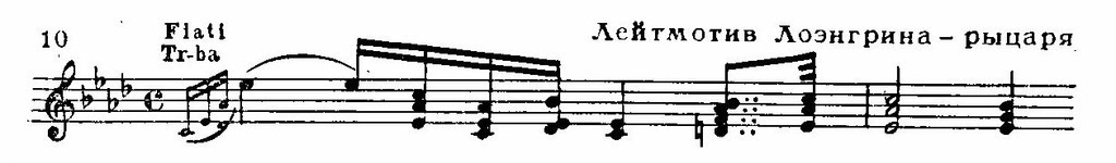 В этом смысле духовное и нравственное одиночество Лоэнгрина — героя, пришедшего из иного мира,— можно назвать полным. Он надеялся, как надеялся и Летучий голландец, найти женщину, которая бы полюбила его бескорыстной любовью, не властвуя над ним и не ревнуя его. Прозрачная пелена, окутывающая героя, не может быть разорвана. Каждая душа хранит тайну, особенно избранная, хранит свою, так сказать, часть ирреальности, столь хорошо переданную во вступлении к опере с его бесконечным колеблющимся движением и сияющим, призывным тембром. Это основополагающий пункт вагнеровской концепции: нечто священное видит он в любом человеке, каков бы ни был его нравственный облик. Особенно четко проявилось это убеждение в «Лоэнгрине»: подлинное значение лейтмотива — открытие свойственной каждому человеку особой духовной сущности. Свет Грааля, неугасимый и неподвижный, словно парящий, уводит человека от низменных жизненных сует, когда те посягают на его внутренний мир.