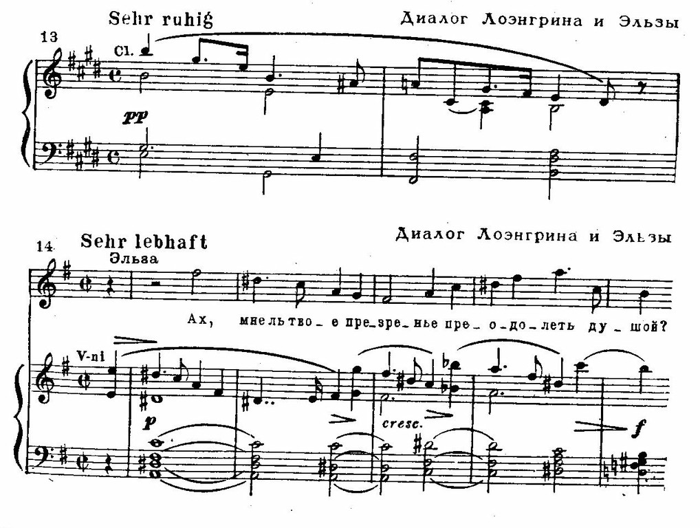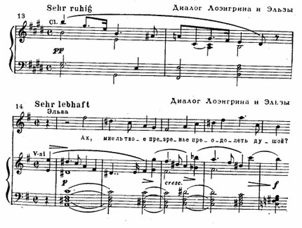 Разнообразные, контрастные чувства запечатлены в этой развернутой сцене. Ее первая половина выдержана в теплых, сердечных тонах. Главенствует задушевный мотив, свойственный речи Лоэнгрина (см. пример 13). Но в развитии беседы Эльза нарушает запрет: тогда в ее устах начинают звучать «змеиные» интонации коварной Ортруды (см. пример 14):