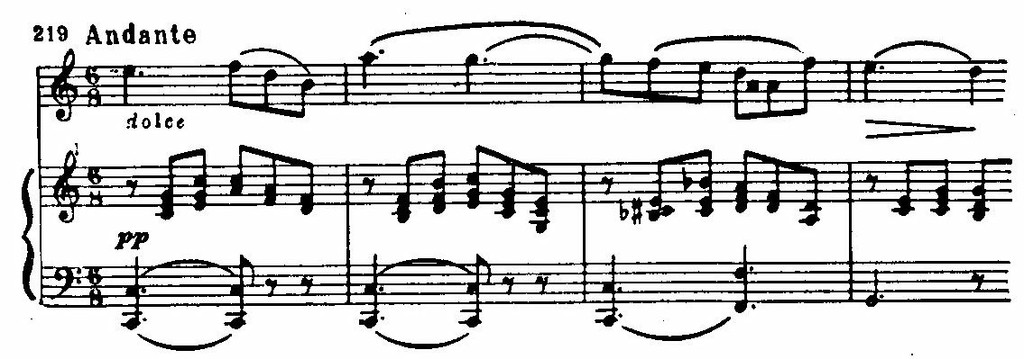 Но ее лирика более открытая, чувство изливается более непосредственно. В очищенной от виртуозного «окружения» теме Andante сосредоточились мелодические обороты и интонации, характерные для лирических образов Мендельсона (Можно указать на сходство темы Andante из Скрипичного концерта с темой медленной части «Шотландской» симфонии. Общие моменты есть даже в манере изложения, характерной и для «Песен без слов».). Усиливая во второй части лирические элементы, концентрируя на них все внимание, Мендельсон создает условия для яркого контрастного восприятия третьей, заключительной, части концерта. Он даже вводит новую песенную тему в переходном разделе, связывающем Andante и финал, которые следуют без перерыва: