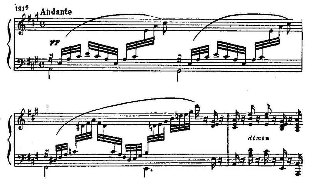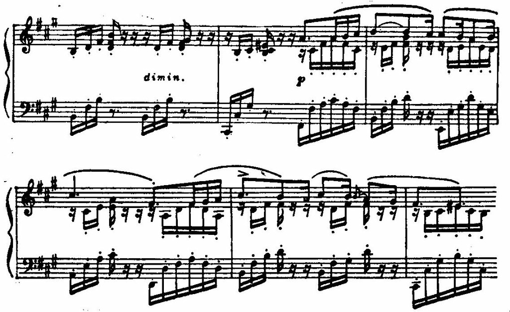 Характерные «пробеги» через сильную долю, устремленность мелодии к «щипковому» аккорду в левой руке, своеобразные перебои акцентов выявляют народно-импровизационную природу этого наигрыша, может быть, гитарного: