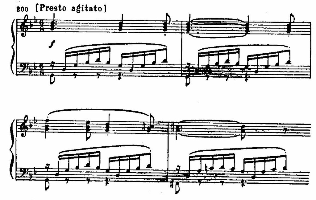 Доминантовая гармония служит моментом «сцепления» наигрыша и песенной темы; в каждом проведении элемент разработочности усиливается, одновременно раздвигается и диапазон фортепианного звучания. Третье, последнее, проведение песенной темы, приобретающей эпическую силу — общая кульминация пьесы: