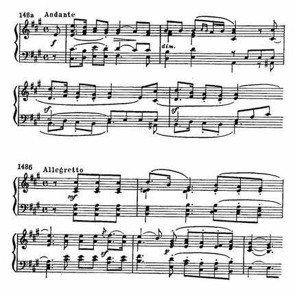Три миниатюры — № 4, A-dur, № 9, E-dur, № 16, A-dur — примеры светлой умиротворенной лирики Мендельсона.