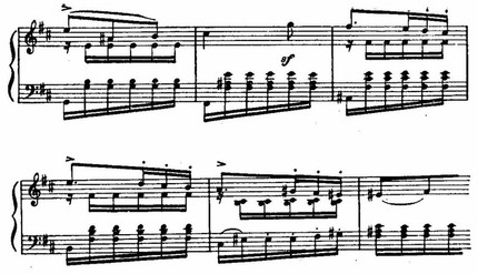 Напряжение сдерживаемого чувства раскрывается в дальнейшем движении мелодии, в акцентировании вводнотоновых тяготений (фраза, примыкающая к первому обороту), в расширенной интервалике последующих фраз и особенно в момент первой кульминации, замыкающей цепь секвенций первой части: