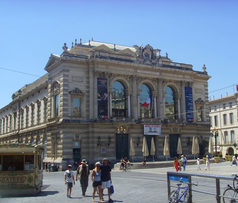 Оперный театр во Франции. Оригинальный проект театра в Монпелье был разработан французским архитектором Жаном-Филиппом Марешалем в 1755 году. Это был довольно простой проект, основанный на традиционном во Франции U-образном плане зрительного зала (в противоположность более распространённому подковообразному по форме залу итальянских оперных театров). Театр впоследствии несколько раз разрушался в результате пожаров: первый раз в 1785 году (восстановлен в 1787 году). В середине XIX столетия он был в значительной степени реконструирован, украшен живописными работами Жана Бодэна, в нём были установлены газовые канделябры.