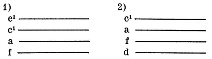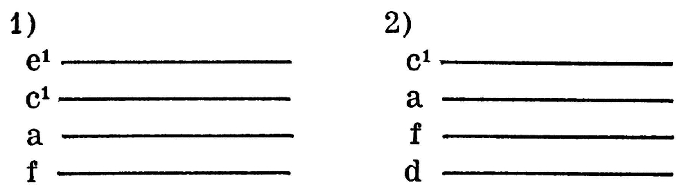 С введением линий над текстом для размещения на них невм произошла существ. перестройка этой системы. Впервые нотная линия была применена в кон. 10 в. в монастыре Корби (хронологич. запись 986). Первоначально её звуковысотное значение не было постоянным; позднее за ней закрепилась высота звука f малой октавы. Следом за первой линией была введена вторая — с1. Линия f прочерчивалась красным цветом, а линия с1 — жёлтым. Усовершенствовал эту нотацию муз. теоретик, монах Гвидо д’Ареццо (итал. Guido d’Arezzo); он применил четыре линии в терцовом соотношении; высота каждой из них определялась расцветкой или ключевым знаком в виде буквенного обозначения. Четвёртая линия помещалась Гвидо д’Ареццо, смотря по необходимости, сверху или снизу: