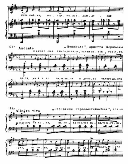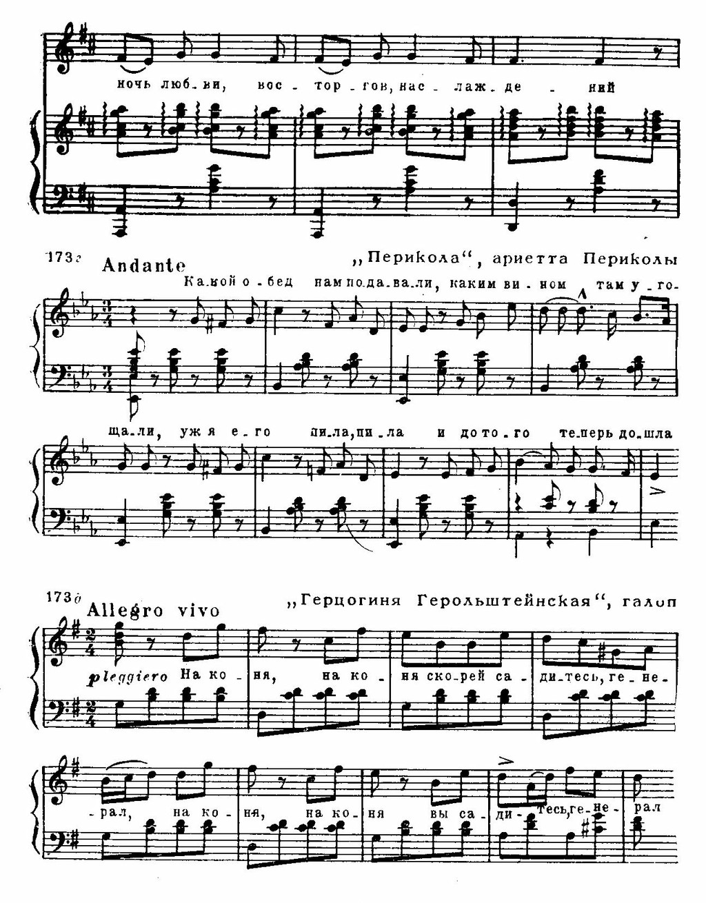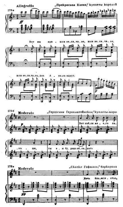 Мелодия и ритм — определяющие факторы музыки Оффенбаха. Его мелодическая щедрость неистощима, а ритмическая изобретательность исключительно разнообразна. Оживленные четные размеры бодрых куплетных песенок сменяются грациозно-танцевальными мотивами на 6/8, маршевый пунктир — мерным колыханием баркарол, темпераментные испанские болеро и фанданго — плавным, легким движением вальса и т. д. Особо велика роль популярных в то время танцев — кадрили и галопа (см. примеры 173 а, б, в, г, д ). На их основе Оффенбах строит рефрены куплетов — хоровые припевы, динамика развития которых носит вихревой характер. Эти зажигательные финальные ансамбли показывают, как плодотворно Оффенбах использовал опыт комической оперы.