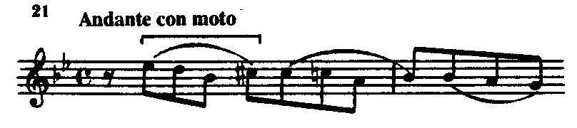 Заключительный раздел сцены письма, тонально перекликаясь с ее началом, в то же время контрастирует ему по выражению. В словах Татьяны, робко вопрошающей: «Кто ты, мой ангел ли хранитель...», слышится и глубокая нежность, и грустное томление. Это смешанное чувство передается мелодической фразой, построенной на плавном нисходящем движении от терции к квинте лада. Особую мягкость сообщает ей гармонический мажор с пониженными VI и VII ступенями. Благодаря многократному повторению в голосе и в оркестре этот оборот приобретает тематическое значение: постепенно ширясь и нарастая, мелодия достигает в оркестровом tutti мощного патетического звучания. Еще раз та же тема появляется во вступлении к четвертой картине (бал у Лариных) как напоминание о печальной тоскующей героине.