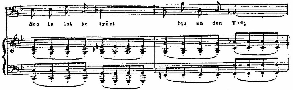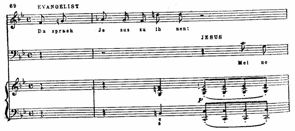 Воздействие выразительной эмоциональной человеческой речи необычайно обогатило интонационный строй баховского речитатива, а тесное взаимодействие слова и звука углубило реализм самих интонаций. Удивительной психологической правдивостью проникнуты фразы Иисуса, передающие чувство одиночества и тоску покинутого всеми человека. Они вкраплены в повествование Евангелиста, так же как и реплики других действующих лиц (учеников Иисуса, судьи Пилата), но в отличие от всех остальных сопровождаются струнным ансамблем:
