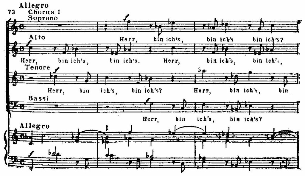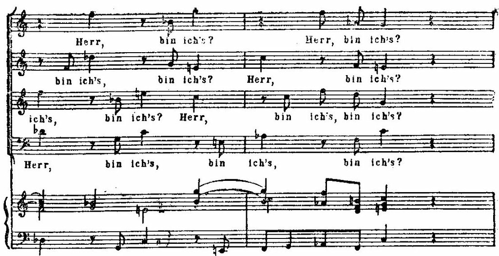 Наряду с замкнутыми построениями крупного плана в «Страстях» есть небольшие драматизированные хоровые эпизоды. В большинстве случаев они воссоздают живой говор отдельных людей (учеников Иисуса) или массы народа и передают непосредственное впечатление, немедленный отклик на какое-либо событие. Как в настоящей музыкальной драме, эти эпизоды вплетаются в драматическое повествование и неотделимы от всей остальной музыкальной ткани. Углубляя логику развития и реализм драматургии «Страстей», подобные хоры усиливают конкретную образность произведения, сообщают ему театральную наглядность, «зримость». В качестве примера приведем небольшое хоровое построение, в котором взволнованные ученики спрашивают Иисуса, кто предатель: