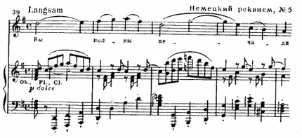 Реквием Брамса по своим художественным достоинствам не уступает аналогичным сочинениям Берлиоза или Верди, но вместе с тем сильно отличается от них. Брамс отказался от канонического латинского текста заупокойной мессы, он его заменил другим — немецким. Но дело не только в тексте, отличия глубже — в новой трактовке содержания реквиема. Брамс не живописует ужасов «страшного суда», не обращается с мольбой о покое для усопших — он находит слова ласки и тепла, идущие от сердца к сердцу, для тех, кто потерял близких («я хочу вас утешить, как мать утешает»,— поется в хоровом рефрене пятой части); он стремится вселить в души страждущих и несчастных бодрость и надежду. Проникновенный лиризм и эпическая мощь — таковы основные сферы выразительности этой партитуры.