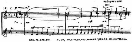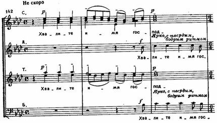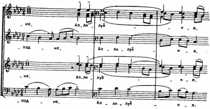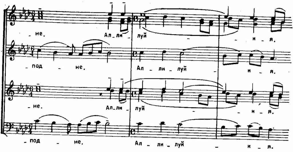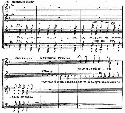 В дальнейшем этот напев переходит к другим голосам хора, модулирует в разные тональности и при этом сам изменяется интонационно, ритмически, в смысле ладовой окраски. Иногда одновременно сопоставляются различные его варианты, как, например, в следующем отрывке, где у высоких женских голосов он широко и выразительно звучит в ритмическом увеличении, в то время как у альтов тот же напев приобретает характер торопливой, взволнованной речитации: