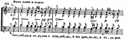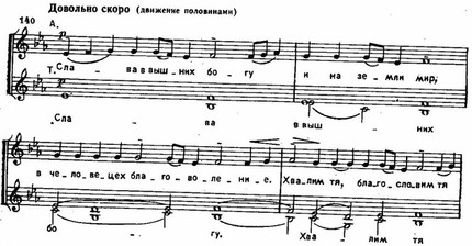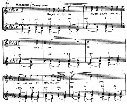 Особенно замечательна в смысле мастерства вариантного преобразования мелодии двенадцатая песня — «Славословие великое». В основе ее простой напев в объеме кварты, напоминающий архаический тип обрядовых народных песен. Вначале он проводится альтами, поддерживаемый скупым гармоническим сопровождением теноров: