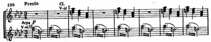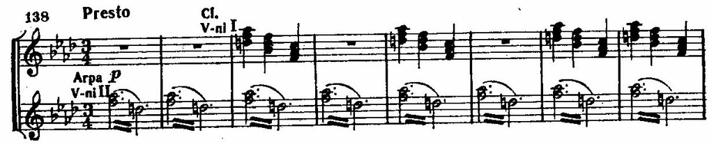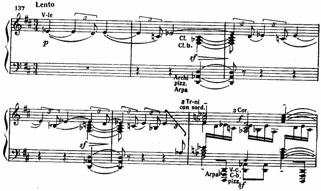 Таким же чисто сонорным эффектом является «выписанная трель» у струнных в низком регистре на звуках трезвучия, повторяющаяся затем полутоном выше.