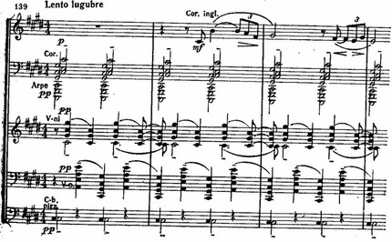 Благодаря быстроте чередования это последование аккордов воспринимается слухом как один сложный гармонический комплекс, колышущаяся, «полыхающая» звуковая масса. В дальнейшем основная гармоническая фигура варьируется ритмически, так что разные трезвучия наслаиваются друг на друга и звучат одновременно. Появляющийся в басу вводный тон придает этому комплексу особую неустойчивость звучания.