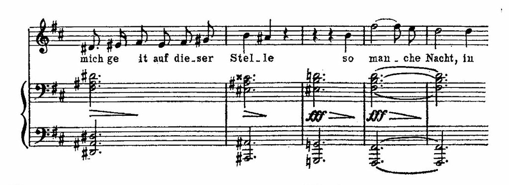 По мере того как в тексте нарастает душевное смятение, в сопровождении преодолевается, нарушается неизменная повторность и завершенность басовой фигуры. А самый драматичный момент, выражающий беспредельные страдания, передается цепью неожиданных смелых модулирующих аккордов. Совпадая с интонациями возгласа в мелодии, они создают впечатление почти бредового ужаса. Эта музыкальная кульминация приходится на точку золотого сечения: