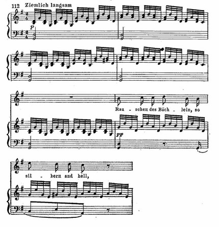 Замечательный образец преломления гейневской лирики у Шуберта – песня «Двойник». Предельно насыщенная декламационная мелодия варьирует в каждой стихотворной строке, передавая все нюансы трагического настроения. Куплетность, лежащая в основе формы «Двойника», затушевывается отчасти благодаря декламационным приемам, но главным образом вследствие своеобразия сопровождения. Краткий, скованный и мрачный мотив фортепианной партии по принципу «остинатного баса» проходит через всю музыкальную ткань романса: