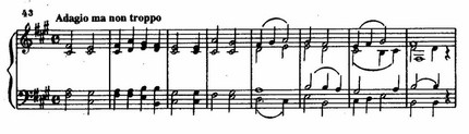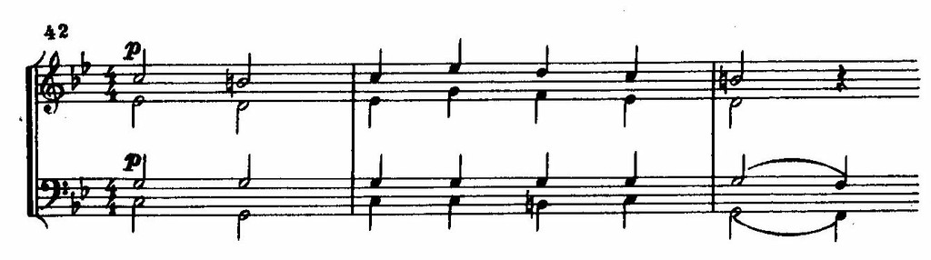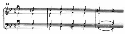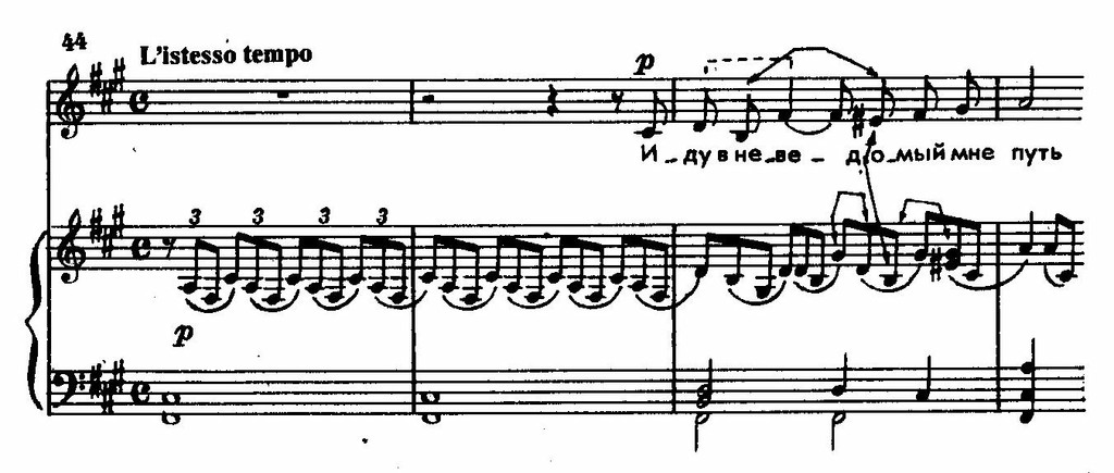 Начало — два мотива, построенные по принципу опевания, одному из ведущих в лирике Чайковского, большую роль он играет и у Танеева. Собственно танеевское в теме — роль тритона. Уменьшенная квинта, увеличенная кварта образуются и по горизонтали, и по вертикали, прямо и скрыто и создают особую, взывающую к развитию напряженность (отмечены в примере).