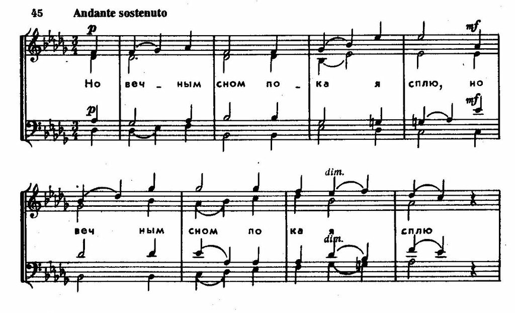 Постоянное употребление вводного тона, а в дальнейшем еще септаккорда II ступени исказило характер мелодии. Именно так, будучи санкционирован авторитетом Капеллы, звучал тогда повсеместно погребальный напев. Танеев тщательно избегает хроматики. Натуральный минор, преобладающая плагальность, окончание на субдоминанте — все это возвращает мелодии подлинность, строгий, сосредоточенный характер.