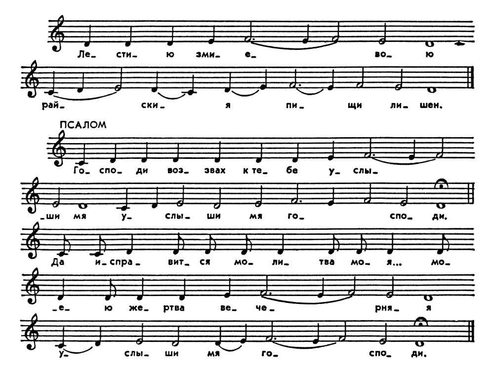 В 1-м примере приведены минорная погласица и образец для пения псалмов на глас. Во 2-м — мажорная погласица и стихира, распетая на основе погласицы. 3-й пример — подобен, т. е. образец для пения текстов, не положенных на музыку.