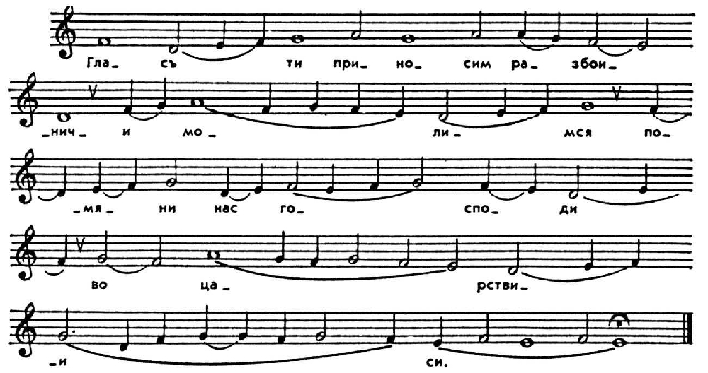 Многие попевки были общими для неск. гласов. Метод композиции оставался прежним. Поскольку строки распевались на основе попевок, изложенных в тетрахордах и пентахордах разл. диатонич. последовательности, и конечные тоны, за очень редким исключением, находились на разных ступенях звукоряда, мелодии были лишены тонального единства.