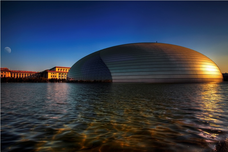 Национальный центр исполнительских искусств находится в Пекине, в непосредственной близости (чуть западнее) от площади Тяньаньмэнь (главная площадь Пекина и самая большая в мире) и Дома народных собраний (китайский парламент) и неподалёку от Запретного города (исторический дворцовый комплекс). Построен по проекту французского архитектора Поля Андрё и задумывался похожим на плавающее в воде яйцо или на каплю воды, этот футуристический дизайн вызвал в своё время много споров о его строительстве в историческом центре Пекина. Действительно, легкоузнаваемый, знаковый облик Национального центра исполнительских искусств представляет резкий контраст с его окрестностями, что делает его очень привлекательным.