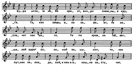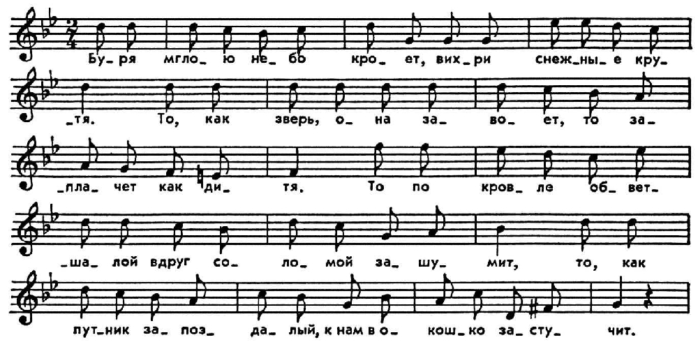 П. свойствен особый тип связи музыки и слова. Мелодия П. является обобщённым, итоговым выражением образного содержания текста в целом; в отличие от романса, она не связана с отд. поэтич. образами или речевыми интонациями текста. В то же время мелодия и текст подобны по структуре; они состоят из равных (в музыке — и одинаковых) построений: строф или куплетов (часто с рефреном — припевом). Внутр. расчленение муз. строфы (куплета) также соответствует расчленению строфы поэтической (см. 1-й пример).