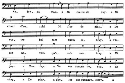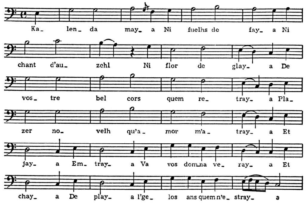 Истоки жанра П. уходят в глубокую древность. В ан-тич. иск-ве поэзия и музыка не были разделены и существовали в виде единого иск-ва П. Одногол. П. трубадуров, труверов, миннезингеров и мейстерзингеров эпохи средневековья обнаруживают неразрывное единство слова и мелодии. Как правило, в них ясно ощутима связь строения поэтич. и муз. строфы, единство рифмы и ме-лодич. каденции (см. 2-й пример).