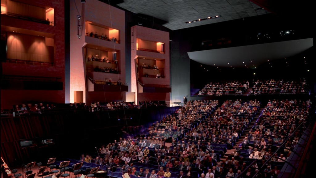 Когда оказываешься в зрительном зале, белое царство овального вестибюля сменяется на темно-красно-коричневую деревянную отделку панелей и синий цвет обивки кресел, Вопреки иллюзии ожидания, он не круглый, а имеет классическую ориентацию вытянутой коробки. Необычно лишь то, что вместо боковых галерей по обе стороны от партера на высоких подиумах возвышаются по четыре многоярусные стойки, похожие на огромные шкафы, на «полках»-ярусах которых оборудованы слушательские места. Полная асимметрия в ориентации этих конструкций несколько сбивает с толку, но сделано это исключительно ради акустики, которая в этом зале просто потрясающая. Ее отличительной особенностью является поистине удивительное сочетание насыщенности и мягкости.