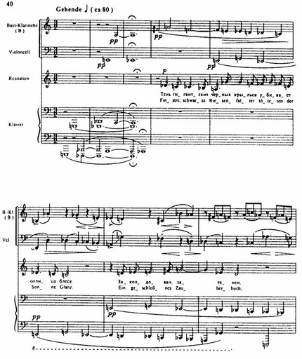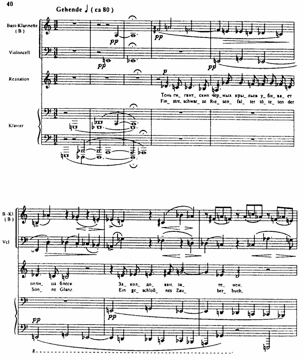 В ряде номеров Шёнберг прибегает к более традиционным методам структурной организации музыки, в особенности к полифоническим приемам развития, всегда ведущим к объективации экспрессии, установлению определенной дистанции между композитором и слушателем. Так, в № 8 («Ночь») мы обнаруживаем свободно трактованную пассакалью (пример 40), ряд номеров основан на канонических приемах изложения, а также на позабытом после Баха ракоходном движении (вскоре этот прием был полностью воскрешен Шёнбергом в технике додекафонного письма).