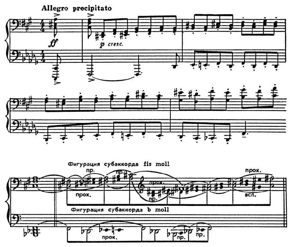 Общая основа для возникновения П. — сложная (диссонантная и хроматизированная) ладовая структура, в к-рой может сохраняться терцовое строение аккордов (особенно на уровне субаккордов). Политоника примера из «Сарказмов» Прокофьева — полиаккорд b — des(cis) — f — ges(fis) — a — это единый сложный центр системы, а не два простых, на к-рые он, конечно, разложим (трезвучия b-moll и fis-moll); поэтому и система в целом несводима ни к одной обычной тональности (b-moll), ни к сумме двух (b-moll + fis-moll). (Подобно тому, как всякое органич. целое не равно сумме своих частей, созвучание разнотональных субструктур сплавляется в несводимую к одноврем. сочетанию двух или неск. тональностей макросистему: «синтез во время слушания», политональные голоса «окрашиваются в одну доминирующую тональность» — В. В. Асафьев, 1925; соответственно, такая макросистема не должна называться именем к.-л. одной старой монотональности, тем более — именем двух или нескольких старых монотональностей, напр. нельзя сказать, что пьеса Прокофьева — см. нотный пример — написана в тональности b-moll.)