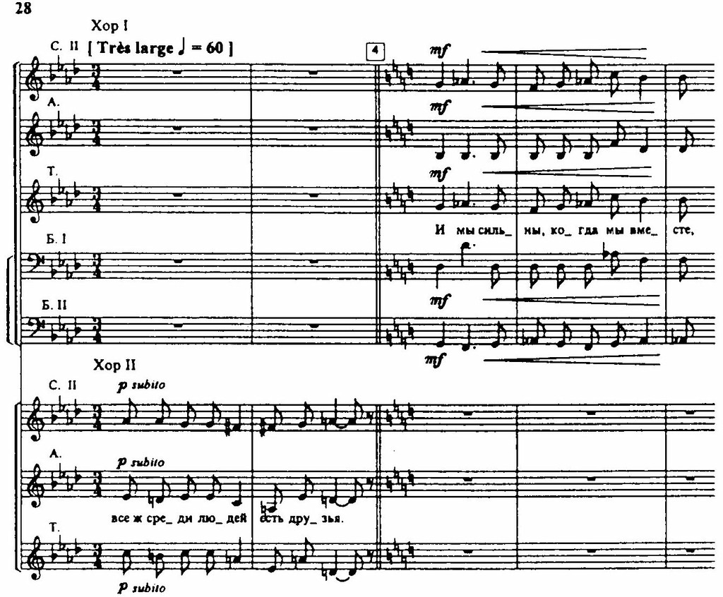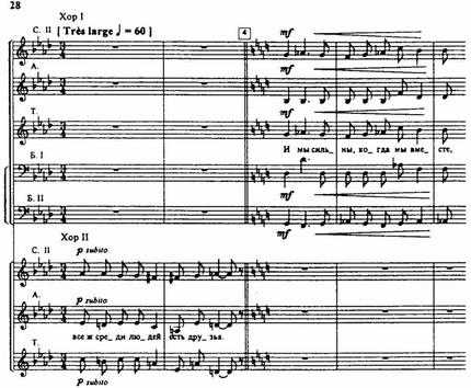 Вторая часть — прощание с безвременно погибшими в борьбе. Голоса звучат сухо, напряженно, и только заключительные слова — о тех, кто отдал жизнь за свободу, — полны тихой нежности и скорби.