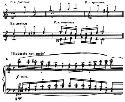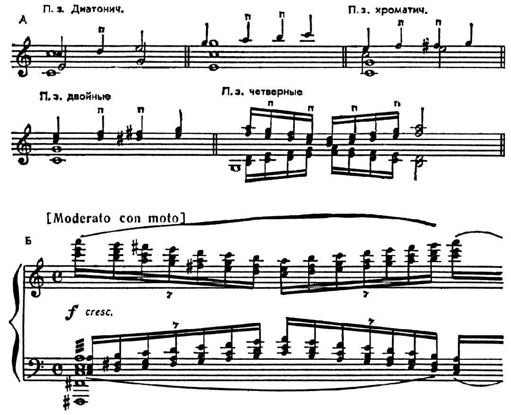 Между П. з. и аккордовым, к-рому направлено мелодич. движение, могут быть введены аккордовый и др. неаккордовые звуки (запаздывающее разрешение П. з.). Попадая на сильную долю (особенно в момент вступления новой гармонии), П. з. приобретают характер неприготовленного задержания. П. з. могут образовывать проходящие аккорды (напр., в коде 2-й части 2-й скр. сонаты Прокофьева цепь хроматич. проходящих аккордов занимает 12-6-й такты от конца). В совр. музыке поступенность П. з. иногда разрывается перебросом их в др. октаву (Прокофьев, 6-я соната для фп., реприза финала, тема A-dur).