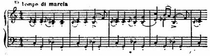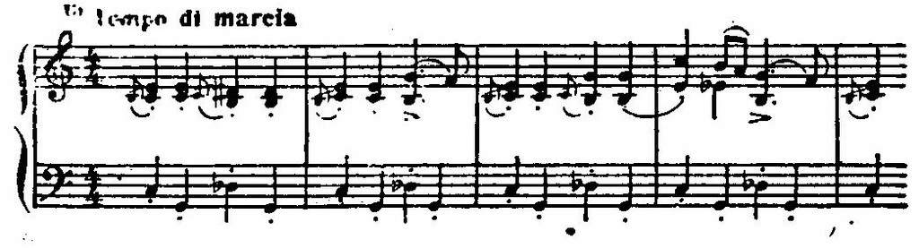 Вторая пьеса — «Прогулка». Трудовой день малыша начался. Его походка тороплива, хотя и несколько с развальцей. Уже в первых тактах передан ее начальный ритм. Надо успеть все увидеть, ничего не пропустить, в общем, дела очень много... Графическая контурность мелодии и характер непрерывного движения с отстукиванием четвертей призваны создать колорит детски наивной сосредоточенной «деловитости». Однако легкость чуть вальсирующего ритма сразу же переводит эту «деловитость» в соответствующие рамки ребячливой «старательности». (Созерцательная тема второй части Четвертой симфонии близка музыке «Утра» и «Прогулки» и, по-видимому, является их предтечей.)