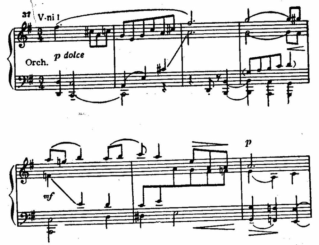 Примечательна также столь характерная для Прокофьева «завораживающая» музыка (цифра 100) перед воздушно скерцозной кодой с новой танцевальной темой (цифра 104). Этот эпизод «сказочного очарования» может служить также примером полиладовости в концерте.