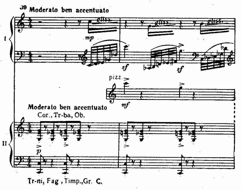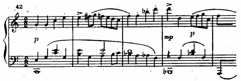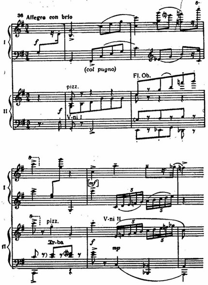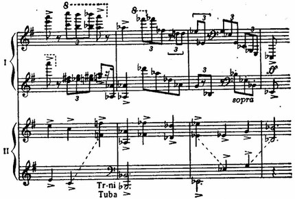 В завершении первой части, не лишенной признаков мозаичности, вслед за веселой гротескной эксцентриадой (реприза главной партии) звучат мощные гирлянды аккордов фортепиано и оркестра (con precisione), как бы в соперничестве наскакивающие друг на друга.