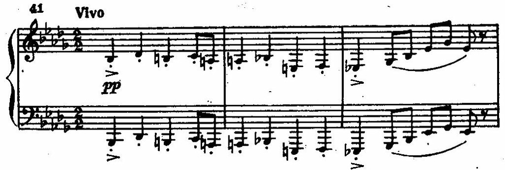 Финал, пятая часть (Vivo), написан вдохновенно. Яркий, разнообразный материал воплощен в сонатной форме. Особенно запоминаются две темы: удивительно легкая, подвижно острая — первая в си-бемоль миноре (приводим партию фортепиано):