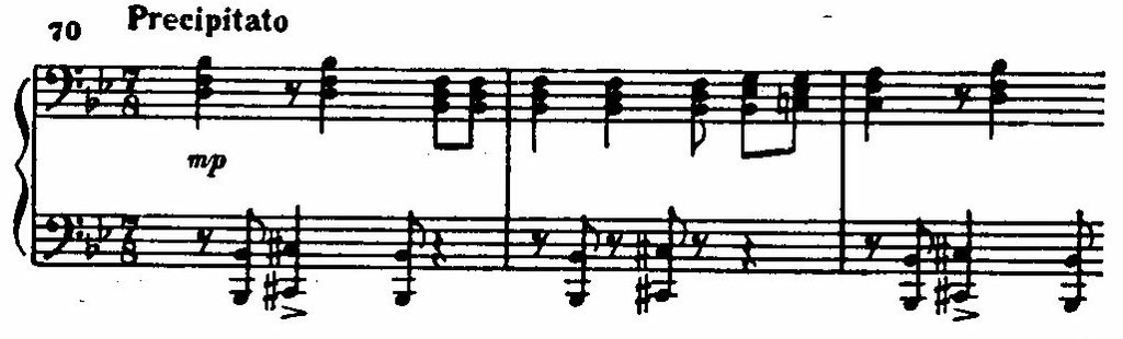 Третья часть — Precipitato — вскоре после появления сонаты была почти единодушно охарактеризована как «своего рода богатырская, стихийно могучая русская токката. И то, что Прокофьев находит здесь «русское» не в мелодике, а в самом зерне «токкатности» — ритме непрерывного движения, — это указывает на глубокое и самобытное понимание Прокофьевым основ русского музыкального стиля» (А. Соловцов. Фортепианная музыка. Сб. «Очерки советского музыкального творчества». М.— Л., 1947, стр. 174.).